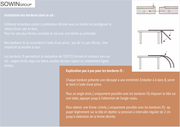 Bordure en acier corten 1mm avec repli anti-coupure (3mm avec le repli). Modèle à enfouir par 1/2 ou 2/3 de la hauteur. Emboitable par le repli. Pliable pour bordure en courbe.